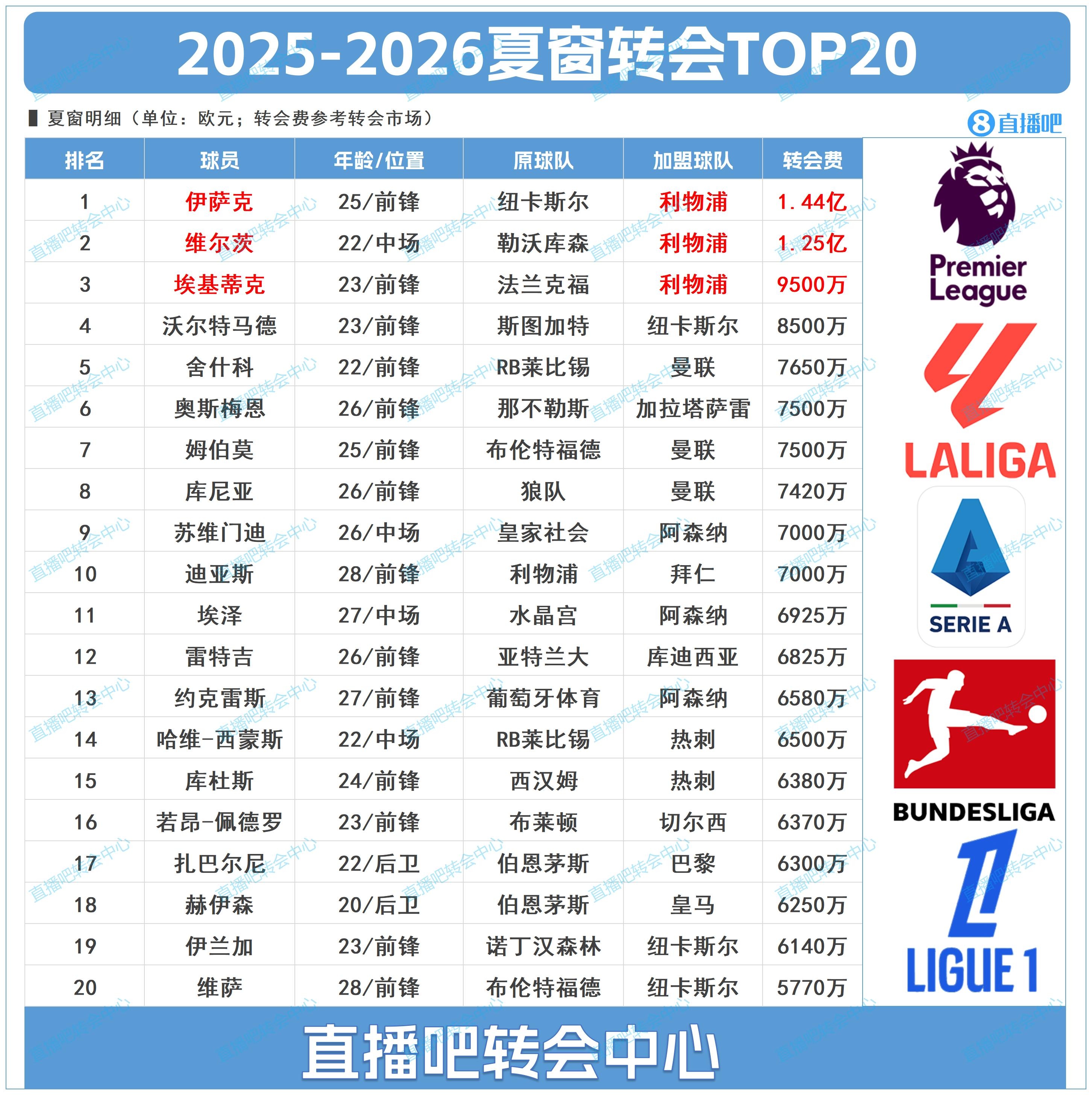 2025夏窗转会TOP20【注:数据参考德国转会市场网】