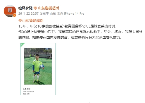 华体会官网-泰山博主晒出彭啸10岁照片,彭啸曾说想留洋,在国内就为国安效力